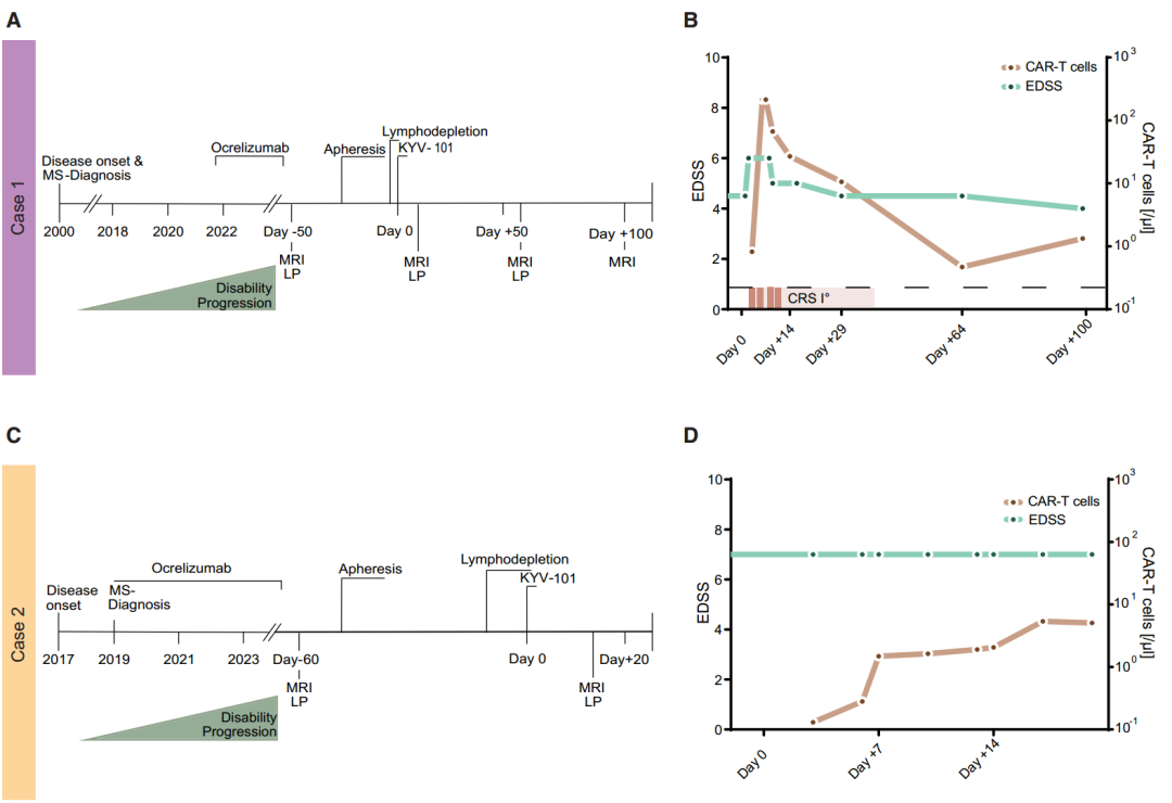 两位患者在使用氟达拉滨(30mg /m2)和环磷酰胺(300mg /m2)进行清淋处理后,接受了单剂量1×108个第二代CD19 CAR-T细胞(KYV-101, Kyverna Therapeutics, Emeryville, CA, USA)治疗,患者的疾病进展时间线示意图如下图所示: